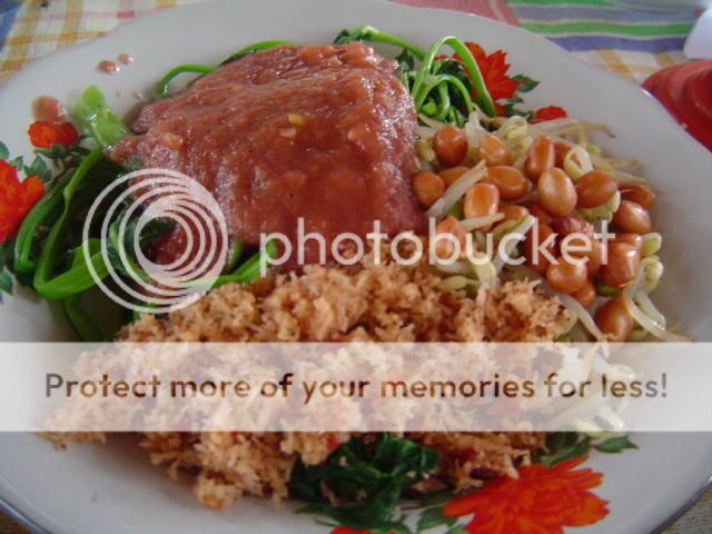 Suwir kangkung yang sudah direbus, letakkan diatas piring. Lalu tambahkan tauge, kelapa parut yang sudah diberi bumbu, tambahkan kacang goreng dan siram sambal diatasnya.